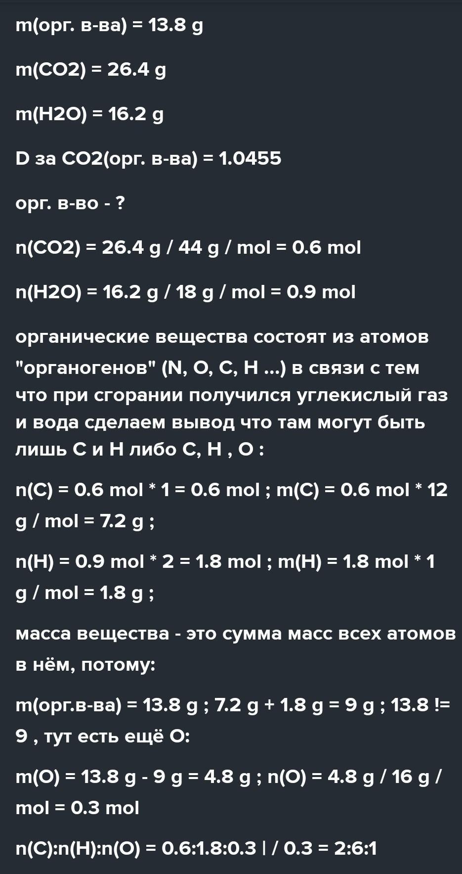 Даю 80 баллов, химия. При спалюванні органічної речовини масою 13,8 г утворились вуглекислий газ об’ємом 13,44 л (н. у.) і вода об’ємом 16,2 мл. Відносна густина парів цієї речовини за вуглекислим газом дорівнює 1,0455. Виведи молекулярну формулу речовини. У відповіді зазнач суму індексів