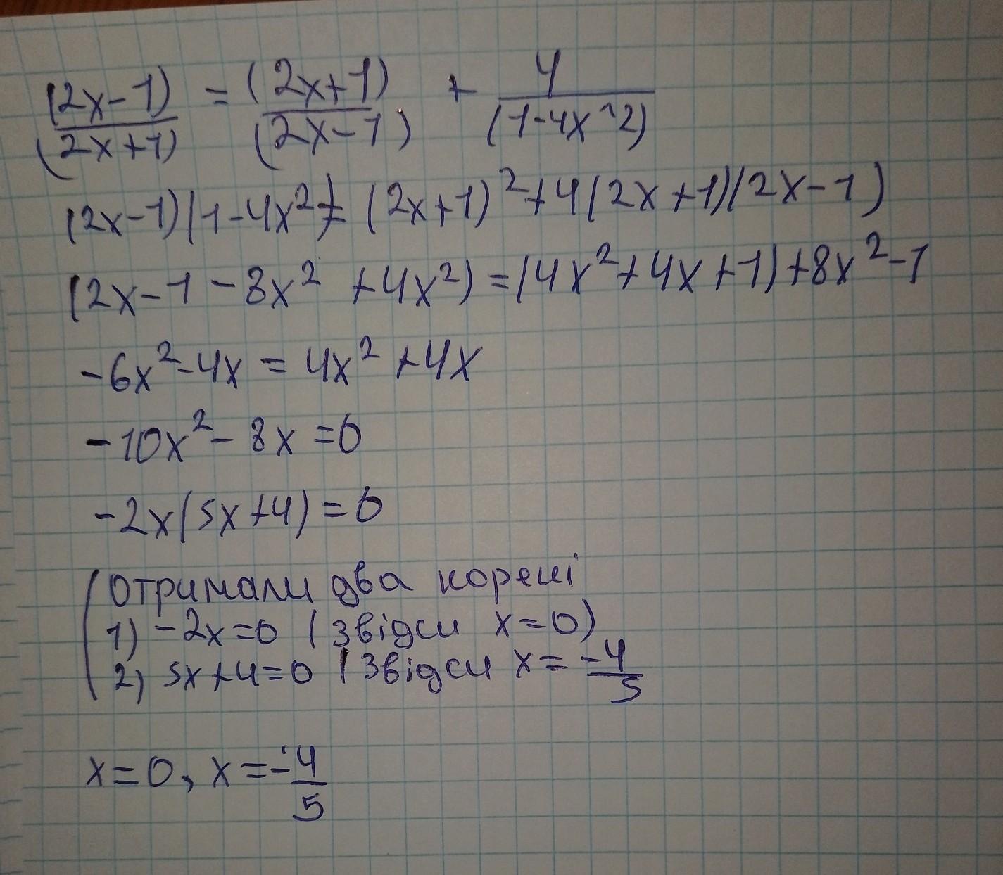 Розв'язати рівняння: (2x - 1)/(2x + 1) = (2x + 1)/(2x - 1) + 4/(1 - 4x ^ 2)