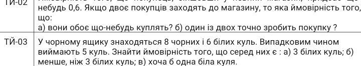 в) Щоб знайти ймовірність мати хоча б одну білу кулю, можна використати протилежне подію (витягти всі чорні кулі) і відняти ймовірність цієї протилежної події від 1: [ P = 1 - \frac{C_8^5}{C_{14}^5} = 1 - \frac{56}{2002} = 1 - \frac{28}{1001} \approx 0.972]