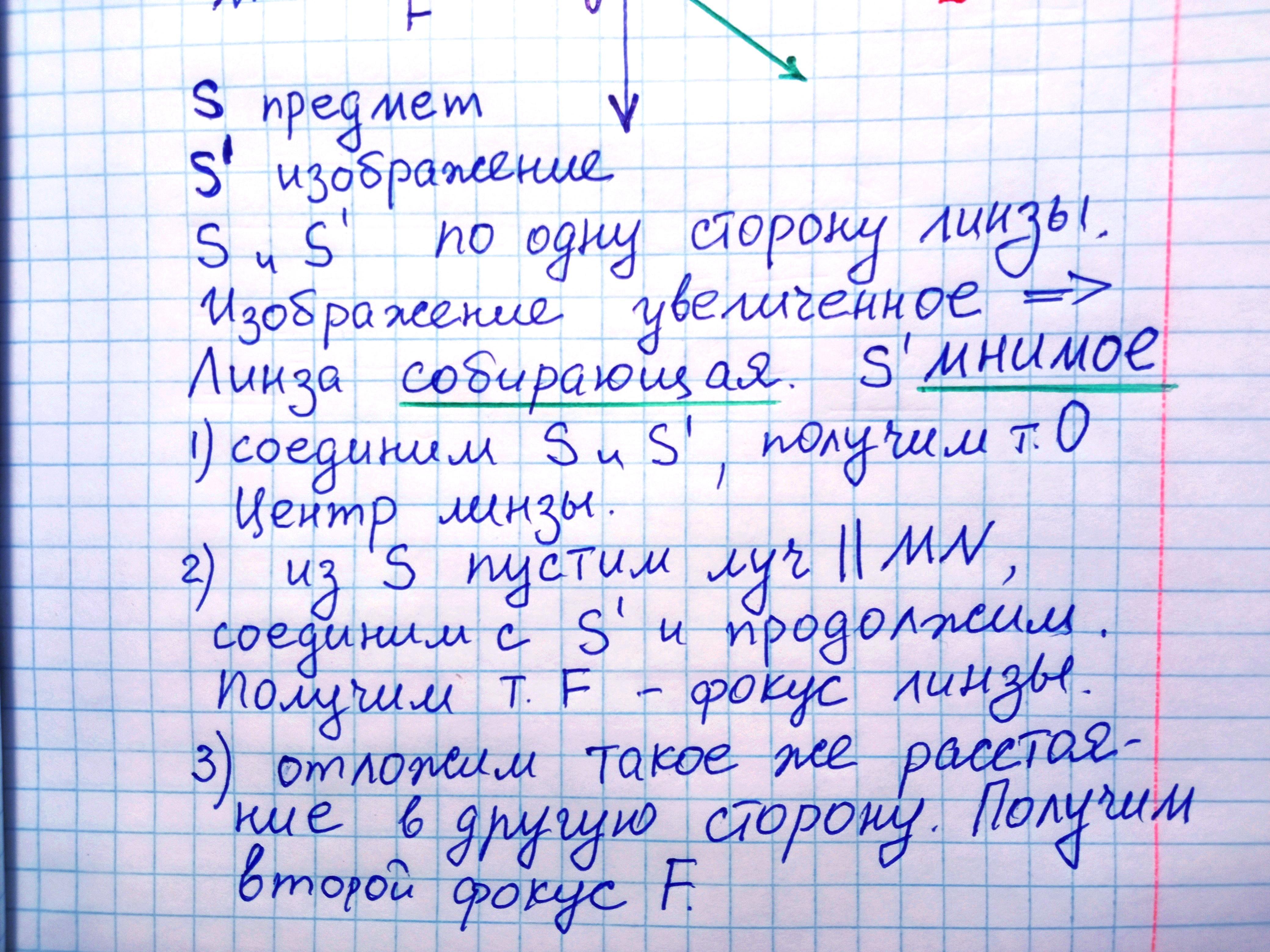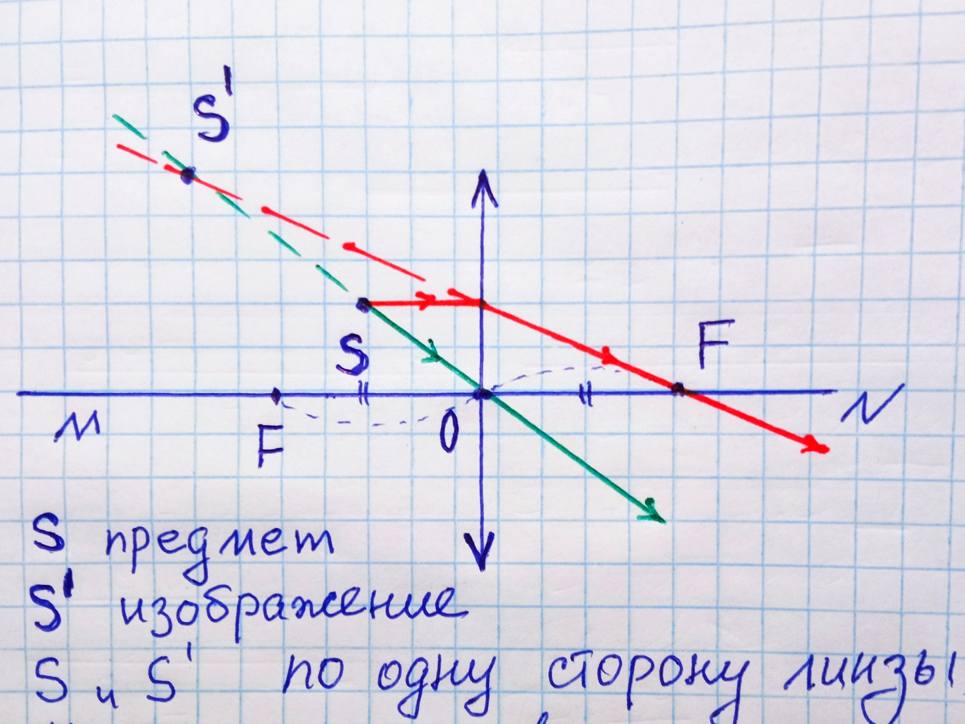 S предмет. S' изображение. S,S' по одну сторону линзы. Изображение увеличенное, значит линза собирающая, изображение мнимое. 1) соединим S и S'. Получим точку О, центр линзы. 2) из S пустим луч II MN. Соединим с S' и продолжим. Получим точку F, фокус линзы. 3) отложим такое же расстояние в другую сторону. Получим второй фокус F.