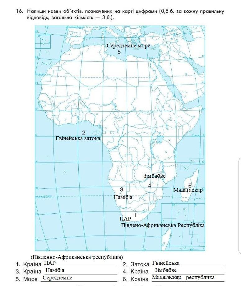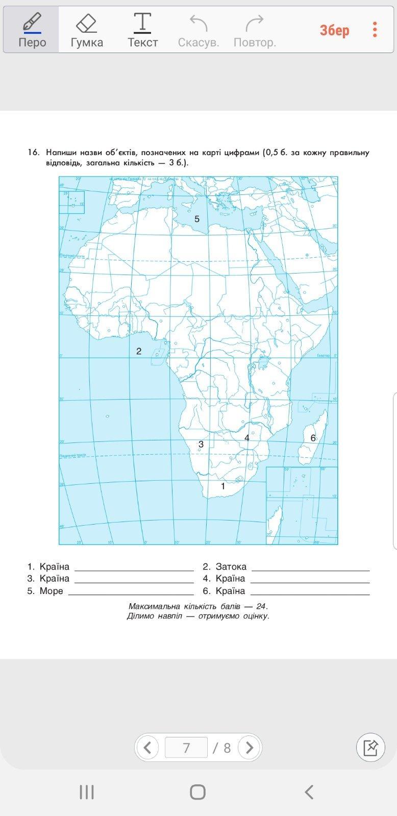 16. Напиши назви об'єктів, позначених на карті цифрами (0,5 б. за відповідь, загальна кількість 36.). кожну правильну