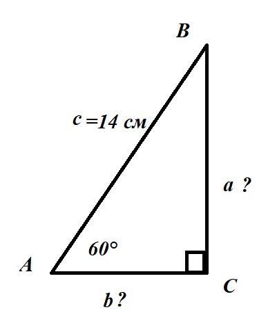 Дано прямокутний трикутник, гострий кут 60° гіпотенуза 14 см. Знайти прилеглий і протилежний катети.