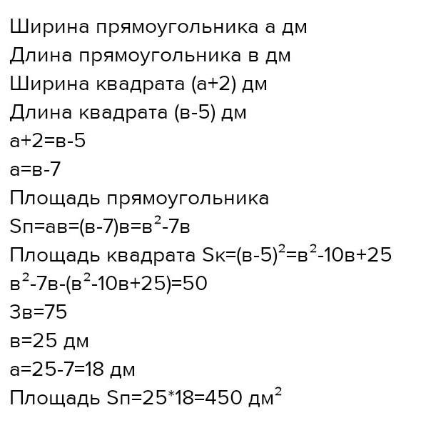 Якщо довжину прямокутника збільшити на 2 дм, а ширину зменшити на 5 дм , то одержимо квадрат площа якого на 50 дм^2 менша, ніж площа прямокутника. Знайдіть площу квадрата