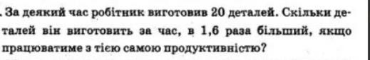 . За деякий час робітник виготовив 20 деталей. Скільки де- талей вiн виготовить за час, в 1,6 раза більший, якщо працюватиме з тією самою продуктивністю,