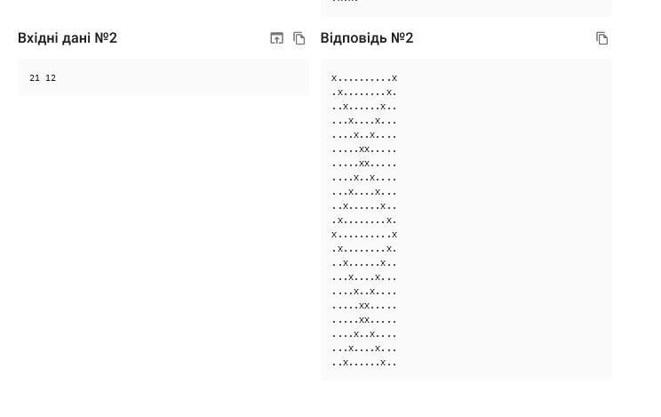 Допоможіть Міс М навчитися вишивати хрестиком та подарувати красиву вишиванку прекрасній Сонечці на день народження, написавши таку програму, яка відповідно до заданої ширини n та довжини m виведе приклад орнаменту.