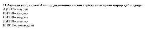 11.Ақмола уездік съезі Алашорда автономиясын терiске шыгарган қарар қабылдады: А)1917 ж. наурыз В)1918ж.кантар С)1918ж.наурыз Д)1918ж. мамыр Е)1917ж. желтоксан ПОЖАЛУЙСТА ПОМОГИТЕ