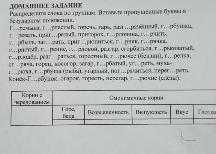 Распределите слова по группам. Вставьте пропущенные буквы в безударном положении. Г...ремыка, г...рластый, горечь, гарь, разг...рячённый, г...рбушка, г...ревать, приг...релый, пригорок, г...рловина, г...рчить, г...рбыль, заг...рать, приг...рюниться, г...рняк, г...рячка, г...ристый, г...рение, г...рловой, разгар, сгорбиться, г...рьковатый, г...рлодëр, разг...раться, горестный, г...рючее (бензин), г...релка, сг...ряча, горец, косогор, загар, г...рбатый, уг...реть, муха- г... рюха, г...рбуша (рыба), угарный, пог...рячиться, перег...реть, Конёк-Г...рбунок, огарок, горесть, перегар, г...рючие (слёзы). Корни с чередованием Горе, беда Омонимичные корни: Возвышенность, Выпуклость, Вкус, Глотка