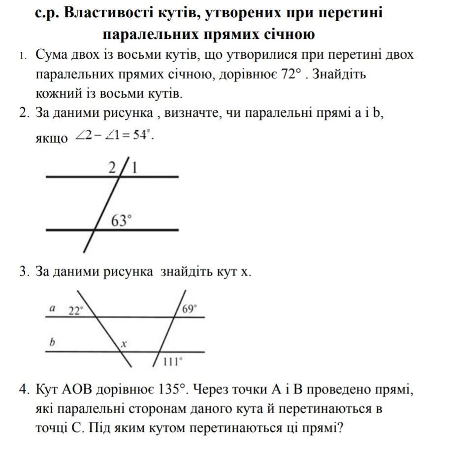 якщо при перетині двох прямих січної навхрест лежать кути рівні, то прямі паралельні: кут 2 і кут 63° навхрест лежать кути, тому прямі паралельні