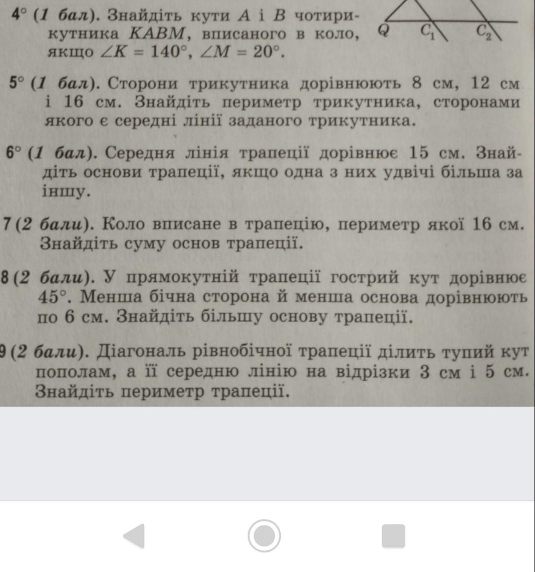 Оскільки чотирикутник вписаний, сума протилежних кутів дорівнює 180°. Звідси маємо, що В = 180° - К = 40°, а А = 180° - М = 160°