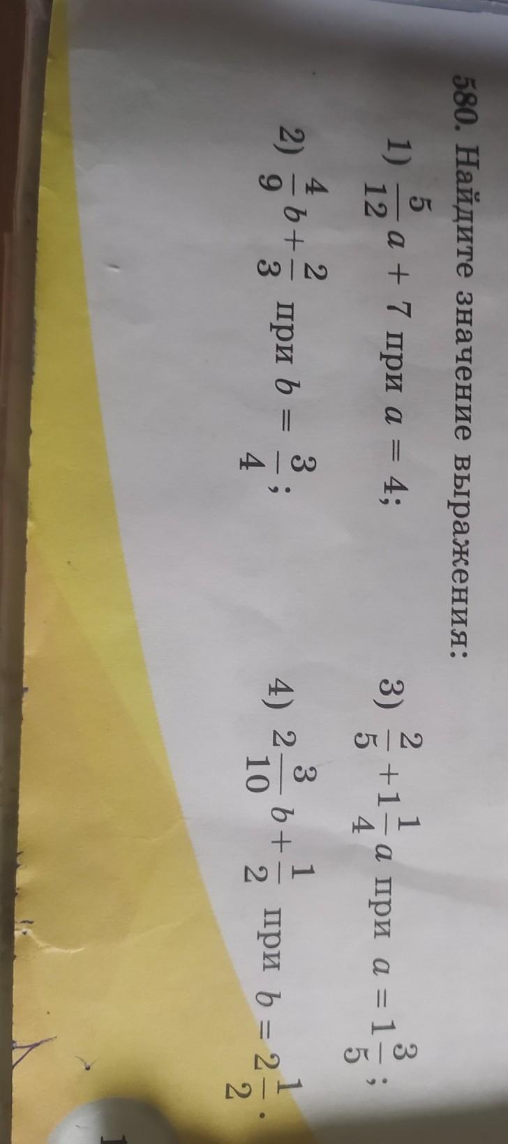 580. Найдите значение выражения: 5 1) 2) 12 а + 7 при а = 4; b+ 2 3 при b = 3 4 9 3) 2 5 +1¹/a 4 3 4) 2- 10 а при а = 1 b+ 1 2 3 при ь = 2 .только 1 и 3