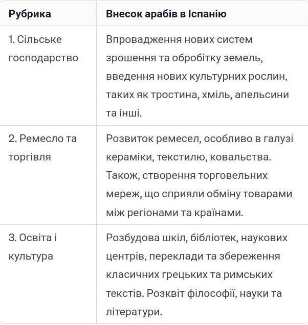 Склади таблицю «Внесок Арабів в економіку та культури Іспанії» за рубриками 1.Сільське господарство 2.Ремесло та торгівля 3.Освіти і культура.