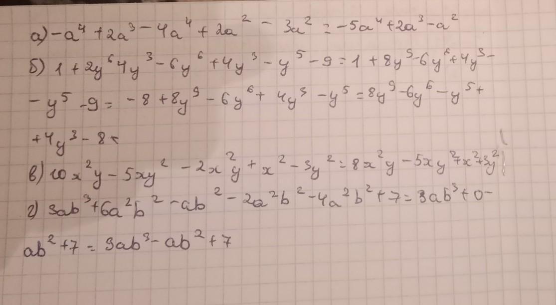 г) 3ab³+6a²b²-ab²-2a²b²-4a²b²+7