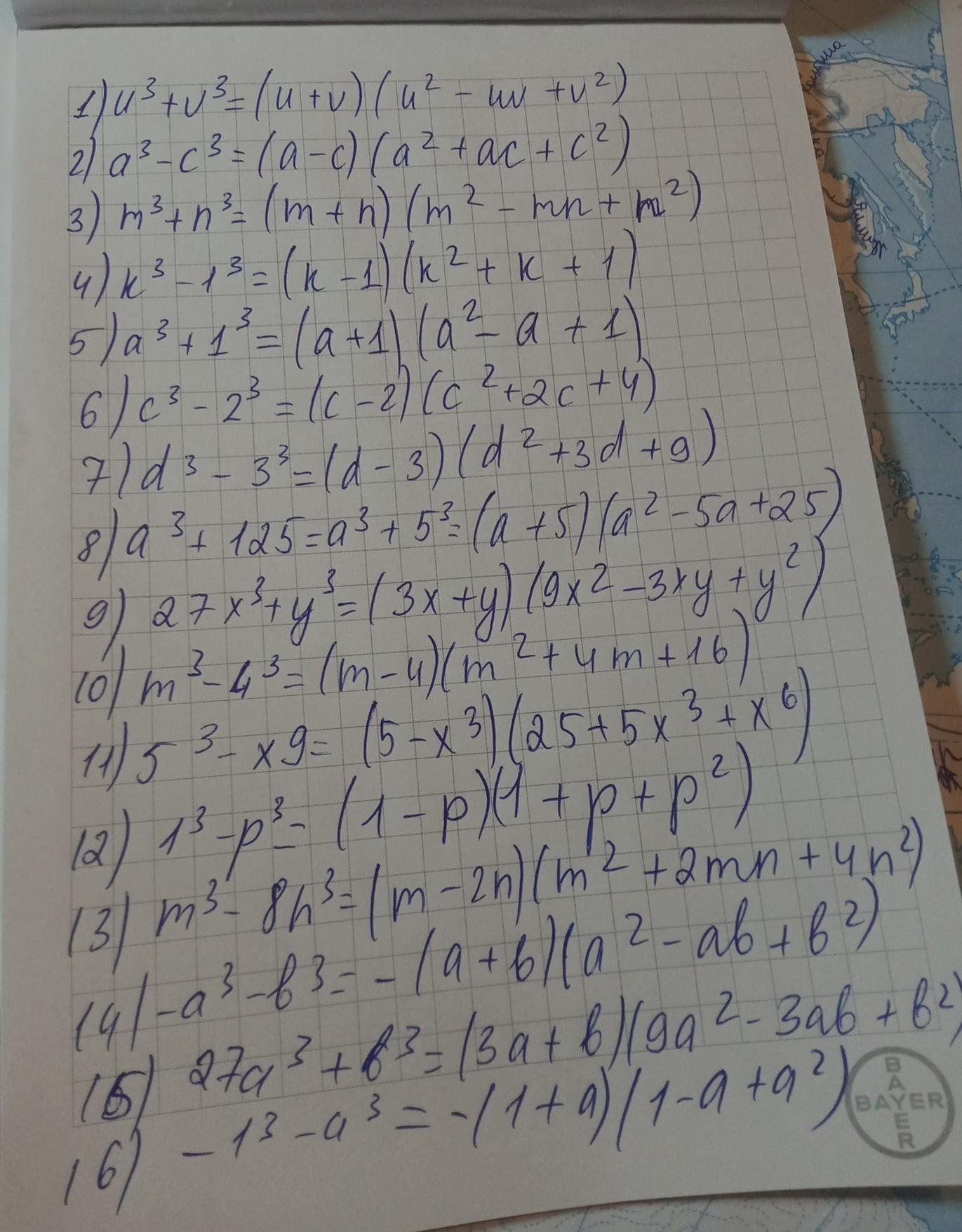 3) m³+n³, 4) k³-1³, 5) a³+1, 6) c³-8, 7) d³-27, 8) a³+125, 9) 27x³+y³, 10) m³-64, 11) 125-x9, 12) 1-p³, 13) m³-8n³, 14) -a³-b³, 15) 27a³+b³, 16) -1-a³.