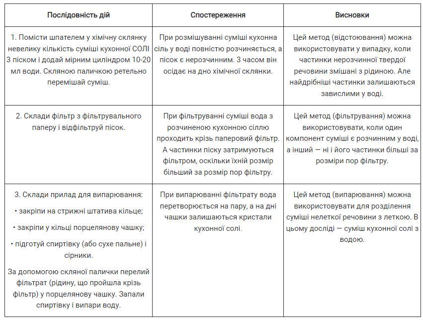Мета. Навчитись готувати суміші та розділяти їх способом відстоювання і фільтрування. На практиці закріпити знання з розділеня сумішей.