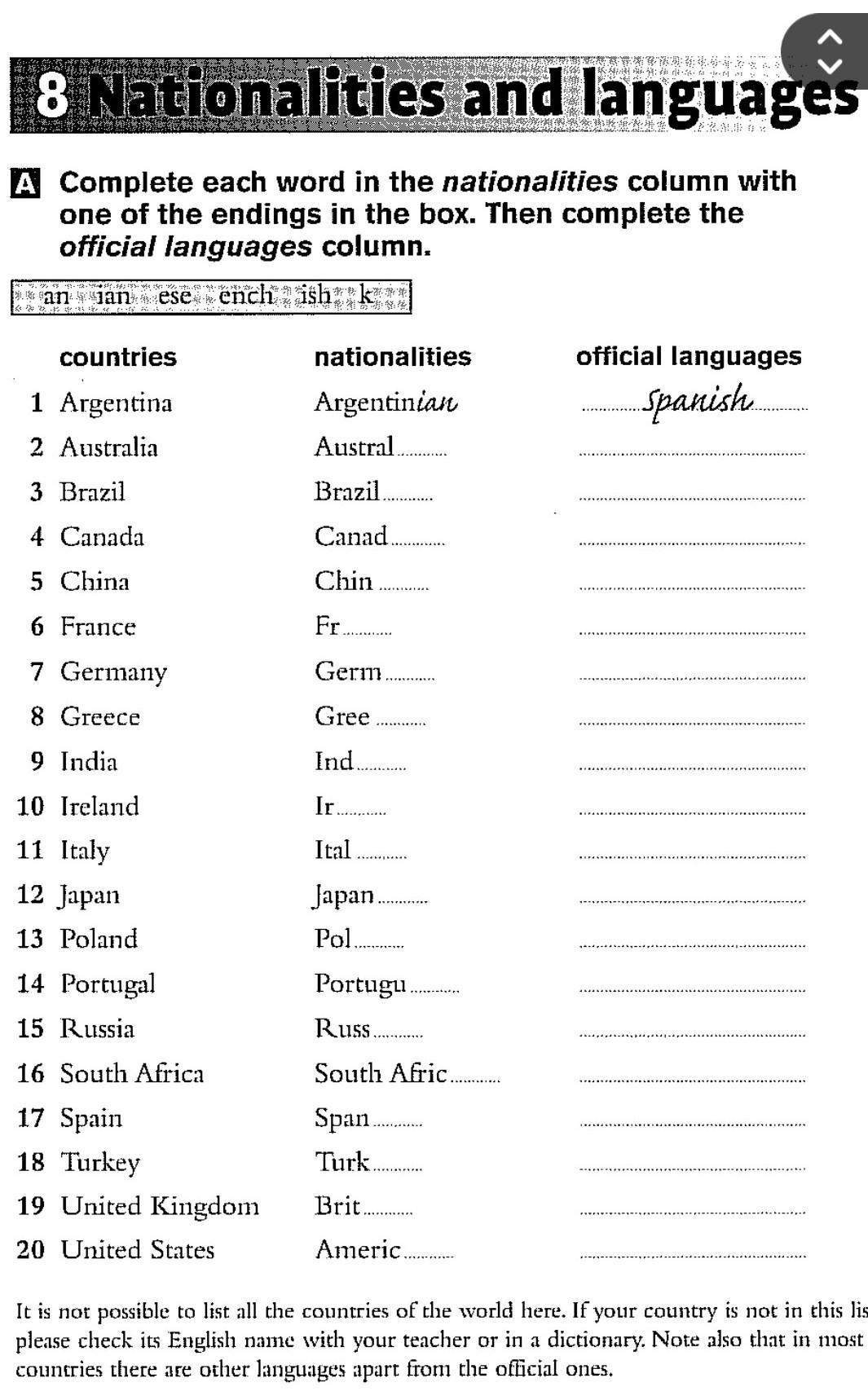 8 Nationalities and languages A Complete each word in the nationalities column with one of the endings in the box. Then complete the official languages column. 4 1954 anan ese ench ish k 44 212 27.3% 19.26 14.3 叶子猪學 countries 1 Argentina 2 Australia 3 Brazil 4 Canada 5 China 6 France 7 Germany 8 Greece 9 India 10 Ireland 11 Italy 12 Japan 13 Poland 14 Portugal 15 Russia 16 South Africa 17 Spain 18 Turkey 19 United Kingdom 20 United States nationalities Argentinian Austral Brazil. Canad. Chin Fr. Germ.. Gree Ind. Ir. Ital Japan. Pol. Portugu. Russ. South Afric........... Span.. Turk. Brit. Americ... official languages Spanish It is not possible to list all the countries of the world here. If your country is not in this li please check its English name with your teacher or in a dictionary. Note also that in mos countries there are other languages apart from the official ones.