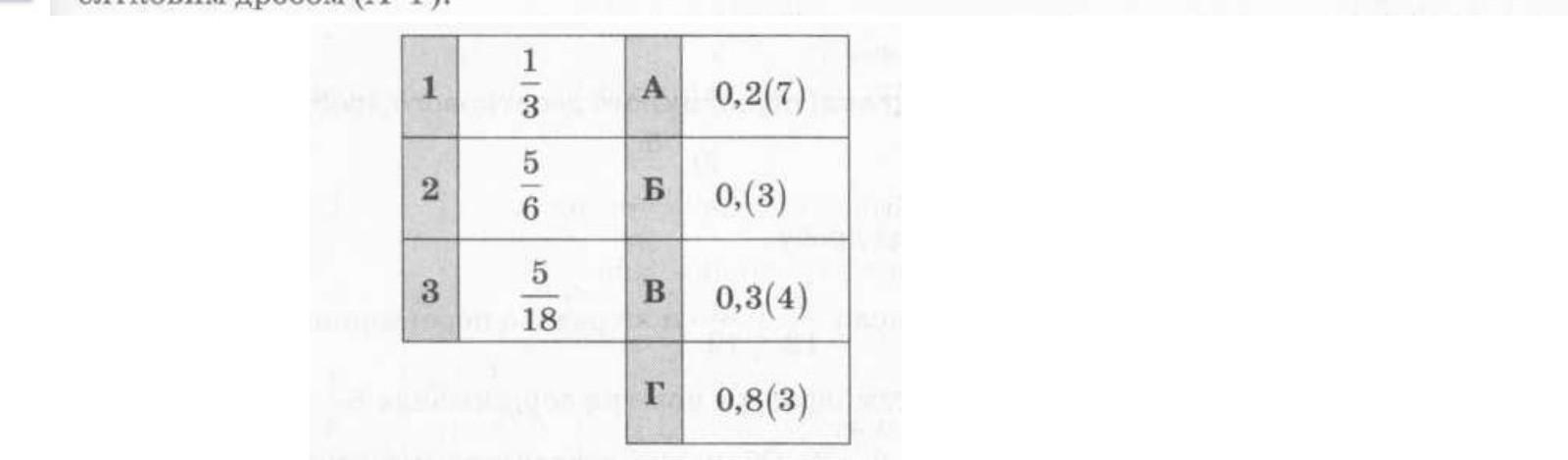 Установіть відповідність між звичайним дробом (1-3) і рівним йому нескінченним періодичним де- сятковим дробом (А-Г). Допоможіть будь ласка потрібно до завтра!!!!