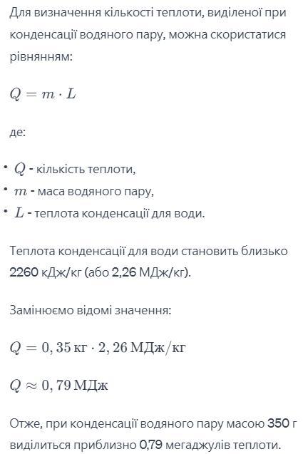 Яка кількість теплоти виділиться при конденсації водяної пари масою 350г у волу з температурою 100°с