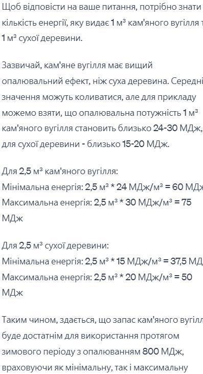 На зимовий період заказали 2,5 м кам'яного вугілля зм³ сухої деревини. Чи вистачить цього запасу для проходження зимового періоду, якщо кожного для використовувати 800 мДж?