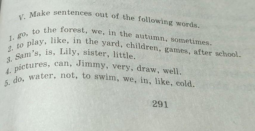 V. Make sentences out of the following words. 2. to play, like, in the yard, children, games, after sch 1. go, to the forest, we, in the autumn, sometimes. pictures, can, Jimmy, very, draw, well. 5. do, water, not, to swim, we, in, like, cold. 4. 291 Пожалуйста помогите дам 100 баллов