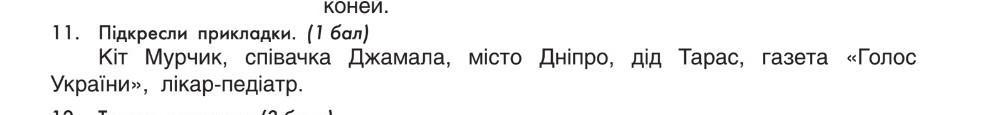 11. Підкресли прикладки. (1 бал) Кіт Мурчик, співачка Джамала, місто Дніпро, дід Тарас, газета «Голос України», лікар-педіатр.