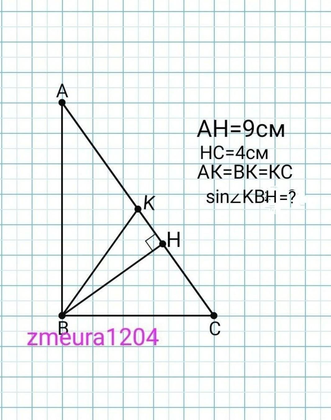 Висота прямокутного трикутника, проведена до гіпотенузи, поділяє її на два відрізки завдовжки 4 см і 9 см. Обчисліть синус кута між цією висотою і медіаною, проведеною до гіпотенузи.