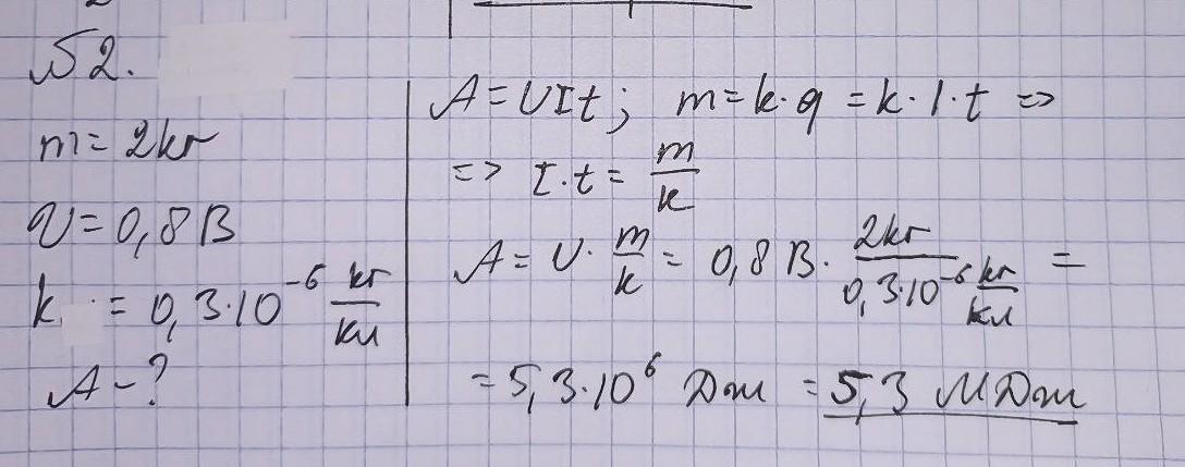 Какую работу проделает электрический ток при электролизе никеля массой 2 кг? Напряжение между электродами 0,8 В. Электрохимический эквивалент никеля 0,3∙10^−6 кг/Кл.