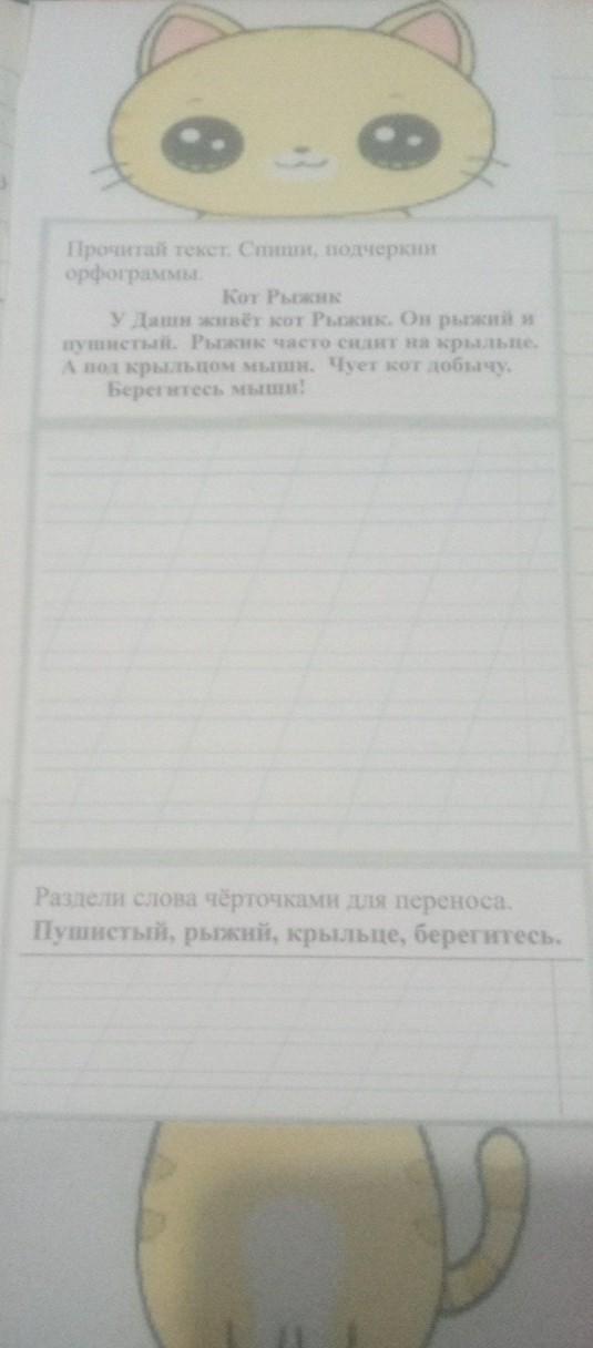 Прочитайте текст Спиши подчеркни орфограммы кот Рыжик у Даши живёт кот Рыжик он рыжий и пушистый Рыжик часто сидит на крыльце а под крыльце мыши чует кот добыча берегитесь мыши