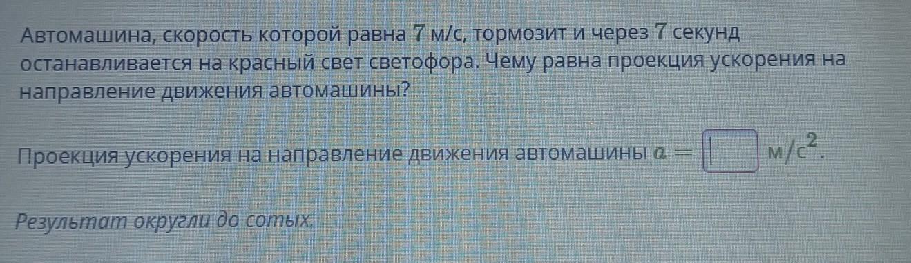 Автомашина, скорость которой равна 7 м/с, тормозит и через 7 секунд останавливается на красный свет светофора. Чему равна проекция ускорения на направление движения автомашины?