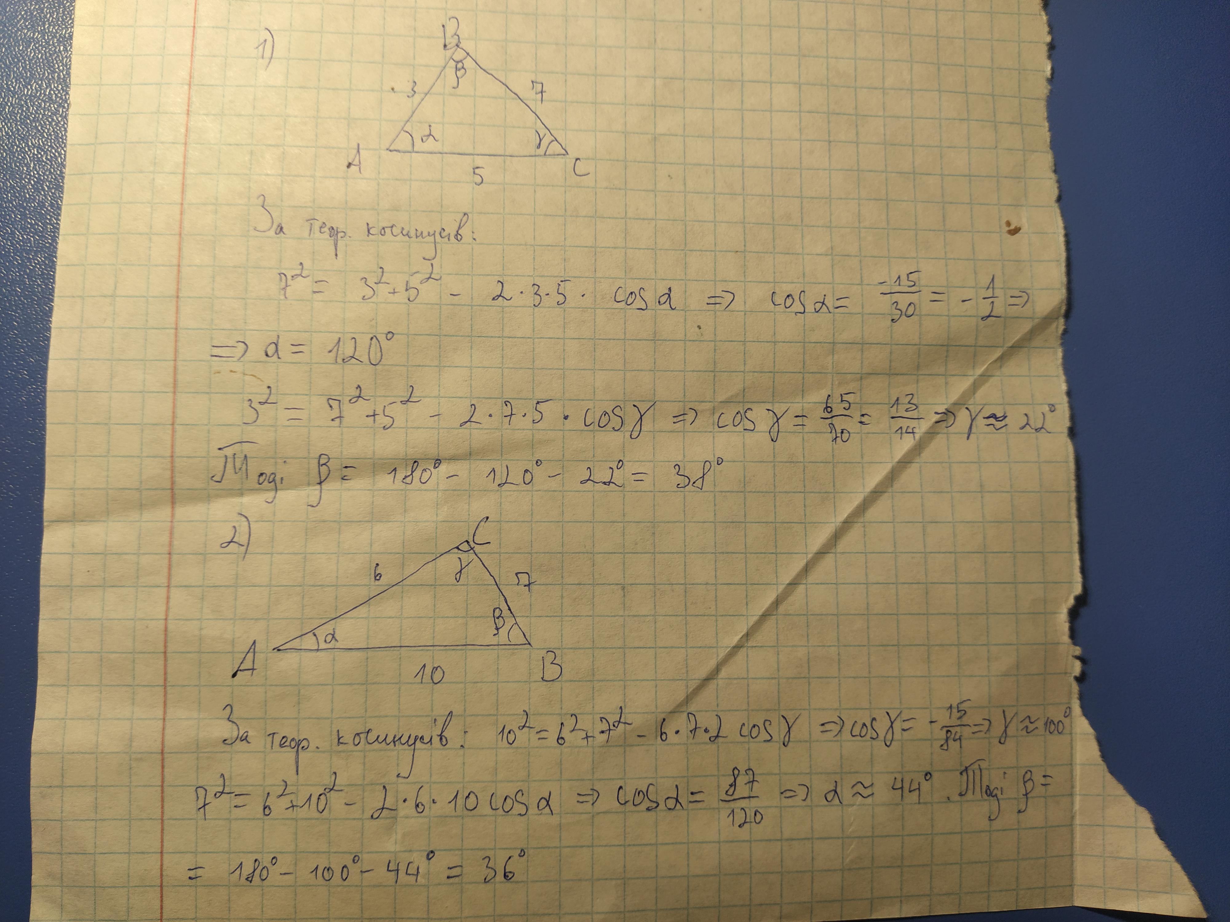 Все робиться через теорему косинусів та арккосинус, але там приблизні значення