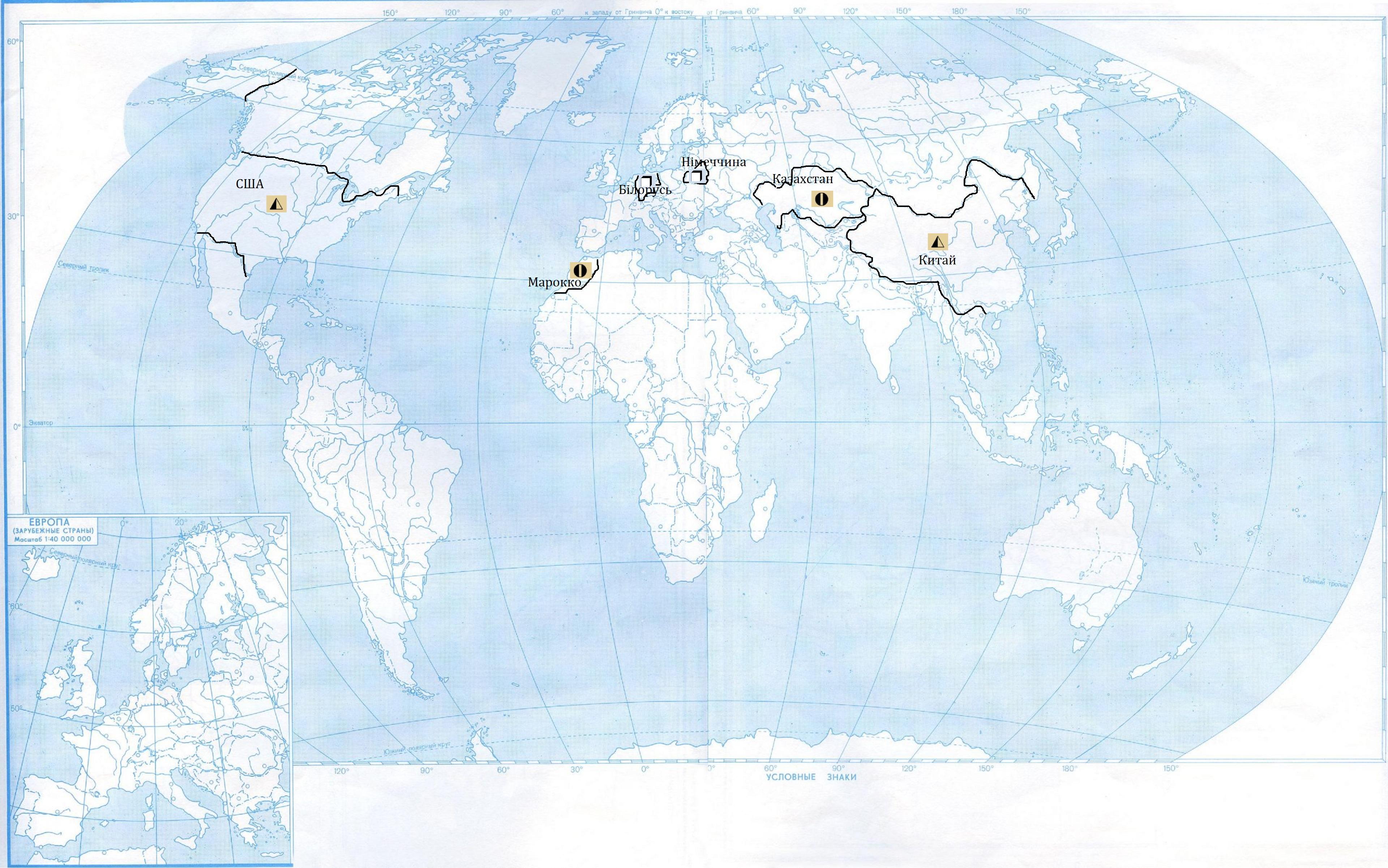 Позначте на карті держави, які володіють значними запасами (по дві за вибором): а) калійних солей; б)сірки в) апатитів та фосфоритів