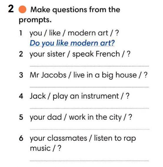 2. does vour sister speak French? 3. does Mr Jacobs live in a big house 4. does Jack play an instrument? 5. does your dad work in the city? 6. do you classmates listen to rap music?