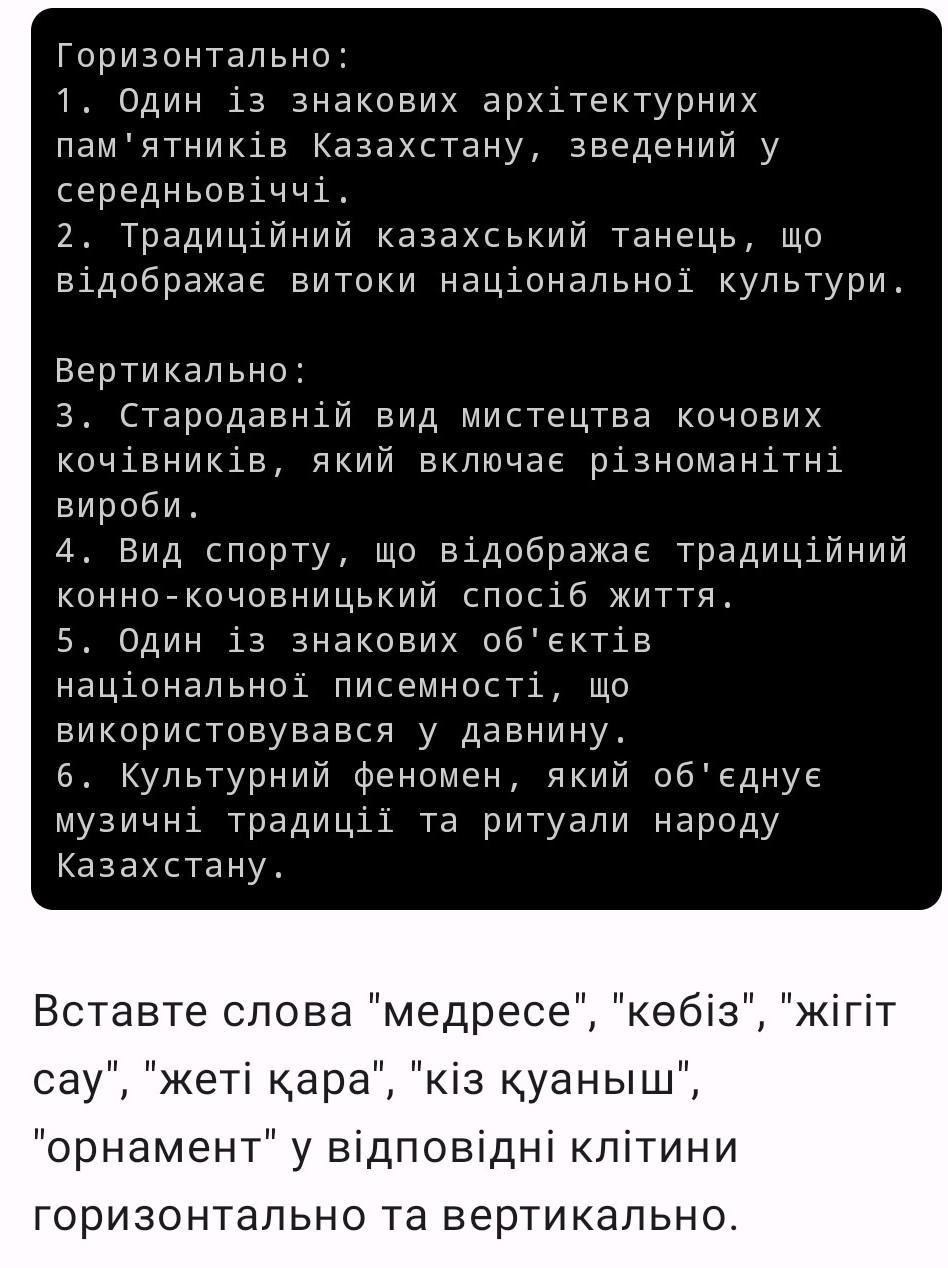 Доделать кроссворд на тему: "Материальная и духовная культура" (6 вопросов) История Казахстана