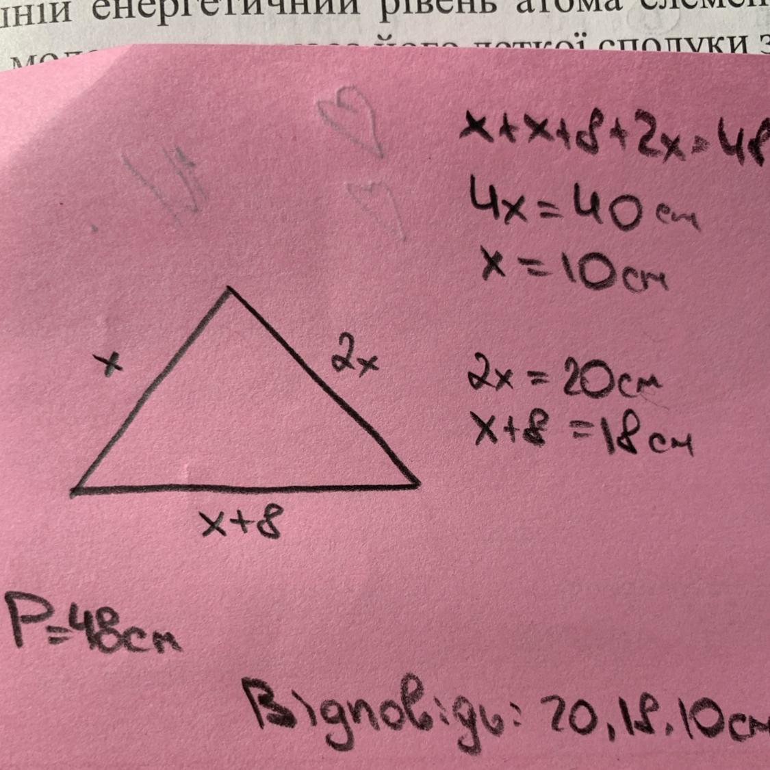 813. Одна сторона трикутника удвічі коротша від другої і на 8 см коротша від третьої. Знайди довжину сторін трикутника, якщо його периметр дорівнює 48 см.