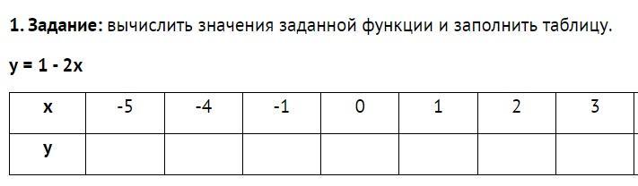 Підставити замість х значення, яке записано в таблиці навпроти х. Потім обчислити за формулою у=1-2х, і значення у записати в таблицю.