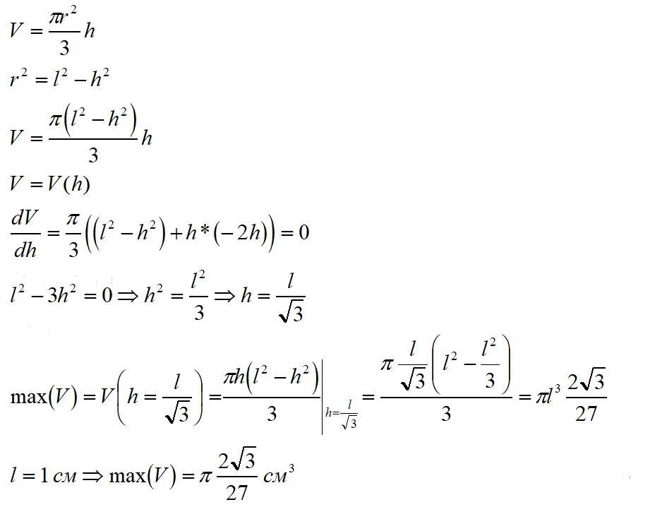Знайти найбільший об’єм конуса, твірна якого дорівнює 1. (Математичний аналіз)