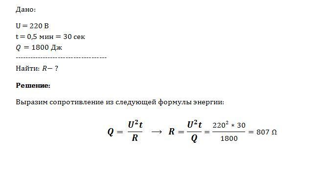 при напряжении 220 В в лампе в течение 0,5 минуты израсходовано 1800 Дж энергии.Определить сопротивление нити лампы.