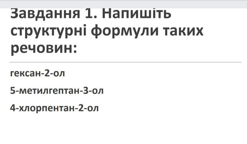 Завдання 1. Напишіть структурні формули таких речовин: гексан-2-ол 5-метилгептан-3-ол 4-хлорпентан-2-ол