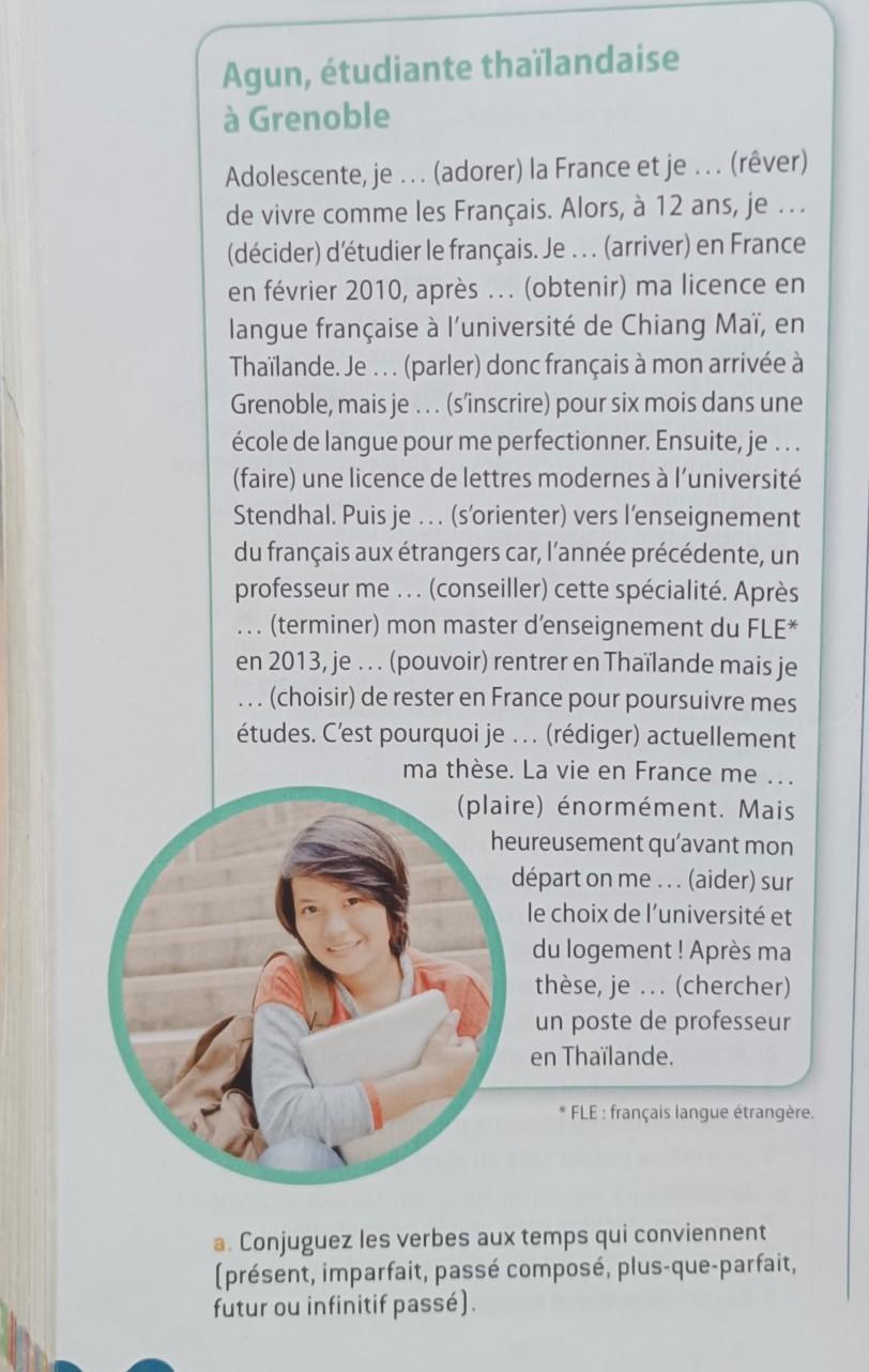 Ответ:Adolescente, je adorais la France et je rêvais de vivre comme les Français. Alors, à 12 ans, je décidais d'étudier le français. Je suis arrivée en France en février 2010, après avoir obtenu ma licence en langue française à l'université de Chiang Mai, en Thaïlande. Je parlais donc français à mon arrivée à Grenoble, mais je me suis inscrite pour six mois dans une école de langue pour me perfectionner. Ensuite, j'ai suivi une licence de lettres modernes à l'université Stendhal. Puis, je me suis orientée vers l'enseignement du français aux étrangers car, l'année précédente, un professeur m'avait conseillé cette spécialité. Après avoir terminé mon master d'enseignement du FLE en 2013, je pouvais rentrer en Thaïlande, mais j'ai choisi de rester en France pour poursuivre mes études. C'est pourquoi je rédige actuellement ma thèse. La vie en France me plaît énormément. Mais heureusement qu'avant mon départ, on m'a aidée sur le choix de l'université et du logement ! Après ma thèse, je chercherai un poste de professeur en Thaïlande.