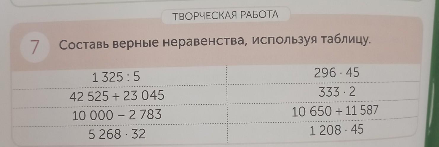ТВОРЧЕСКАЯ РАБОТА 7 Составь верные неравенства, используя таблицу. 1325:5 42 525+23 045 10 000 - 2 783 5268-32 296-45 333-2 10 650 +11 587 1208-45