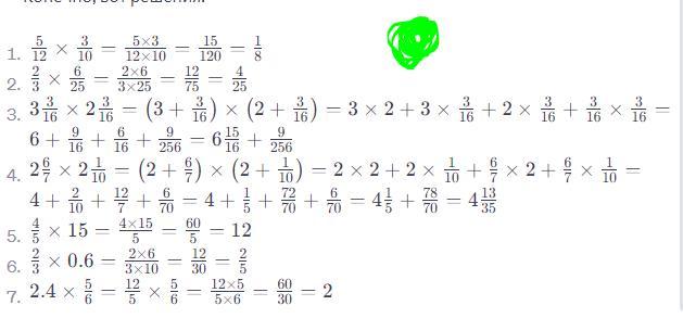 Помогите пожалуйста 1. 5/12*3/10 2. 2/3*6/25 3. (3 3/16 * 2 3/16) 4. 2 6/7* 2 1/10 5. 4/5*15 6. 2/3*0,6 7. 2,4*5/6. Всего тут 7 заданий..