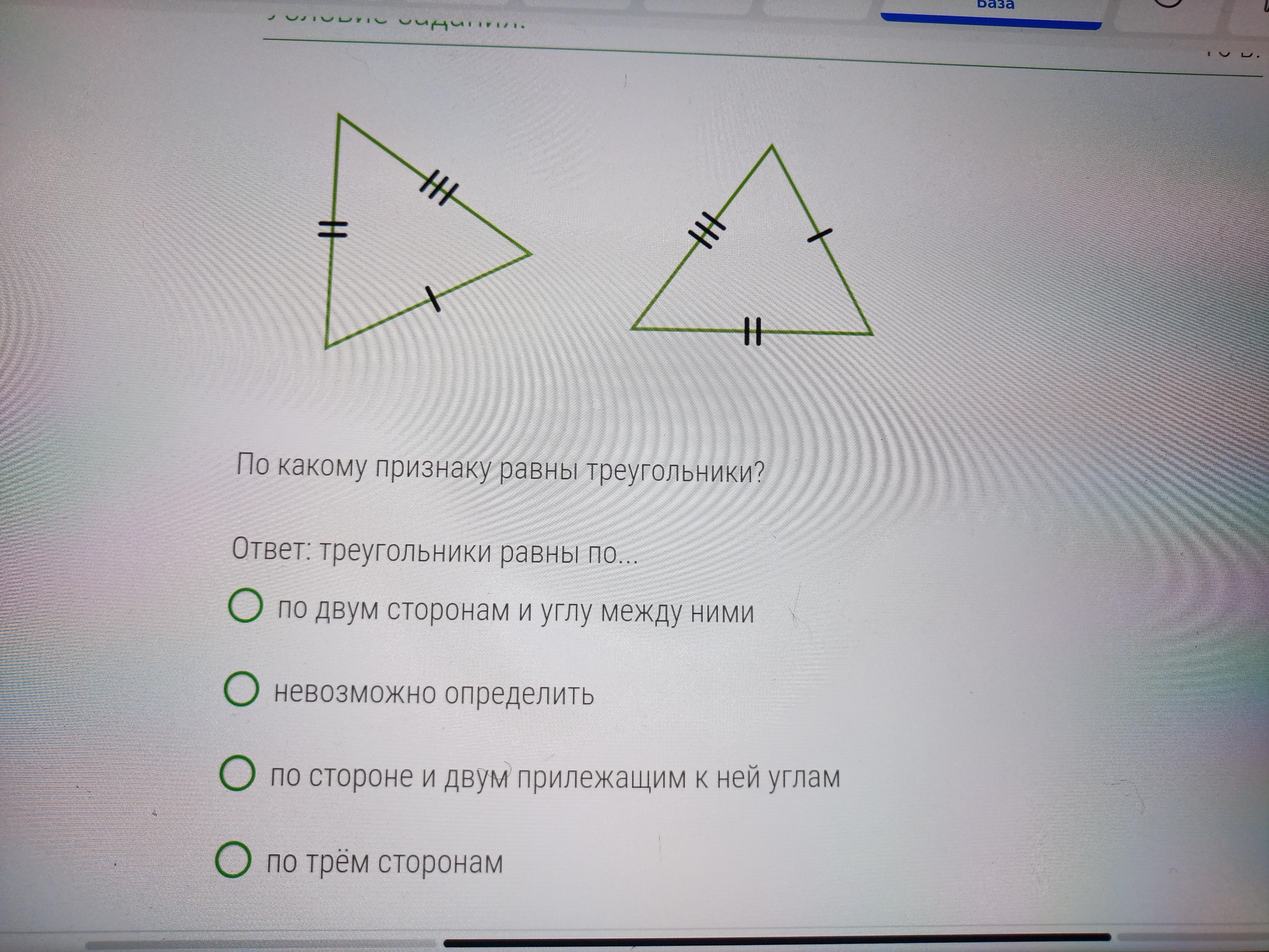 мені здається що відповідь *по двум сторонам и углу между ними*