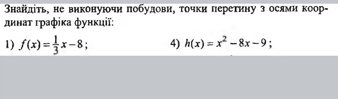 Знайдіть, не виконуючи побудови, точки перетину з осями координат графіка функції.