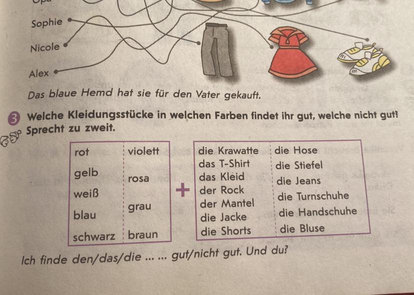 -Ich finde auch. Diese blaue Hose ist auch gut. Finest du?