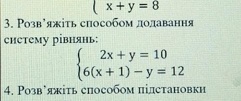 3. Розв'яжіть способом додавання систему рівнянЬ: 2x+y= 10 6(x + 1) - y = 12