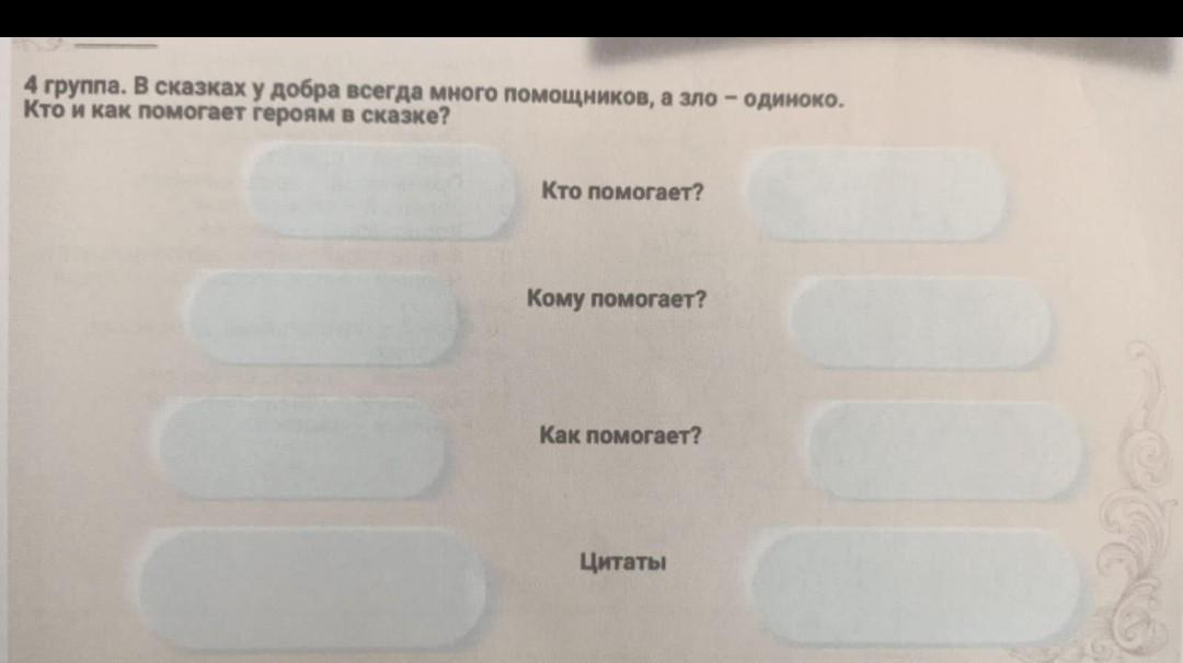 4 группа. В сказках у добра всегда много помощников, а зло - одиноко. Кто и как помогает героям в сказке? Кто помогает? Кому помогает? Как помогает?