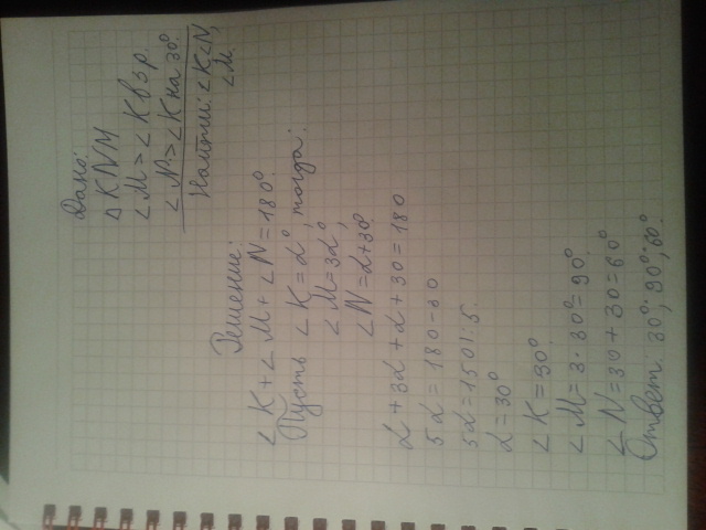 в треугольнике kmn угол к меньше угла м в 3 раза и меньше угла n на 30 градусов.найдите углы треугольника