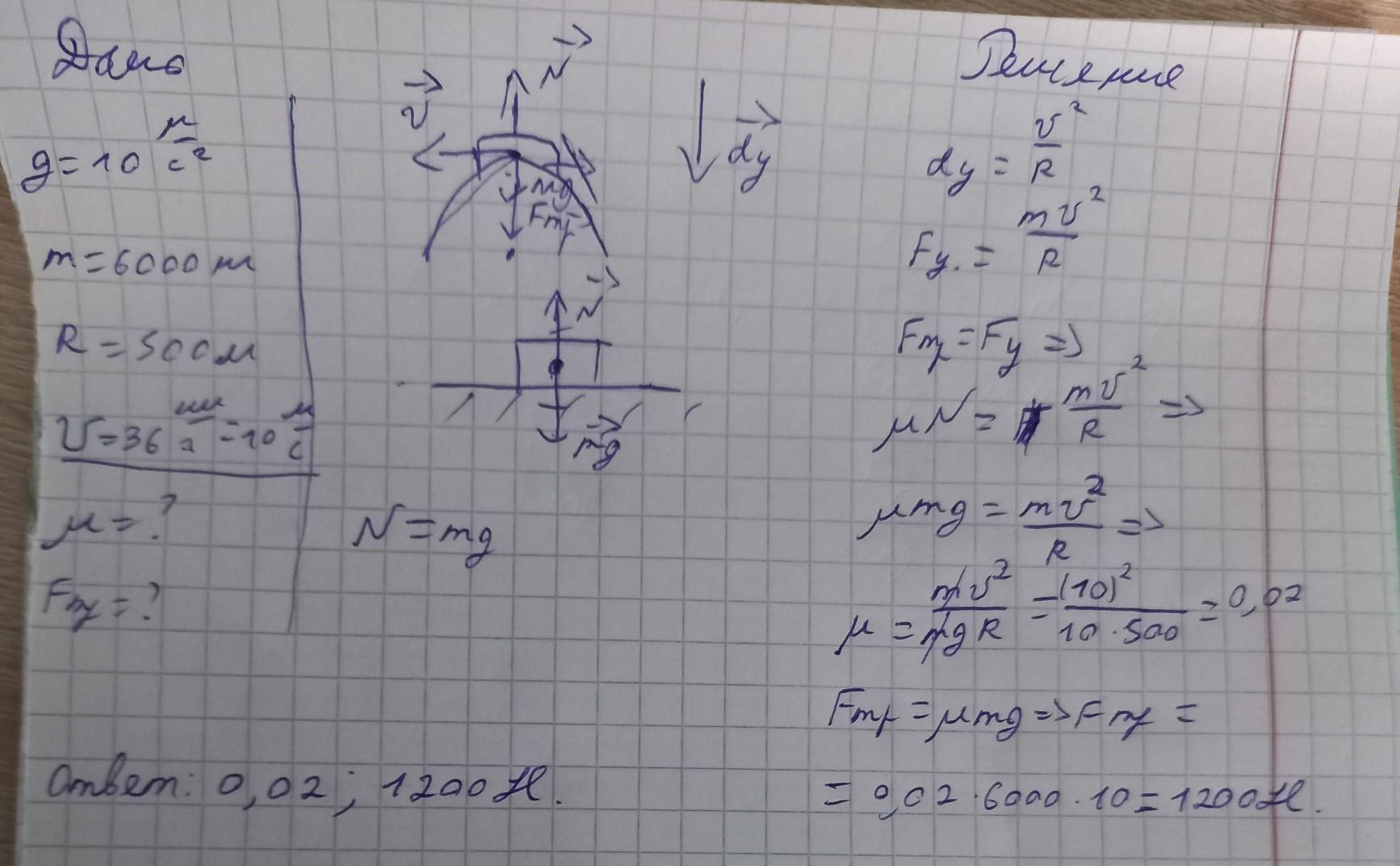 Автомобиль массой 6000 кг проходит закругление горизонтальной дороги радиусом 500 м со скоростью 36 км/ч. Определите коэффициент трения шин, а также силу трения.