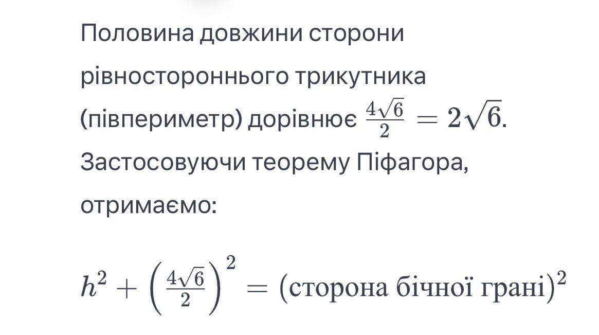 СРОЧНО!!!бічна грань правильної трикутної піраміди є рівносторонній трикутник зі стороною 4√6 визначте висоту цієї піраміди