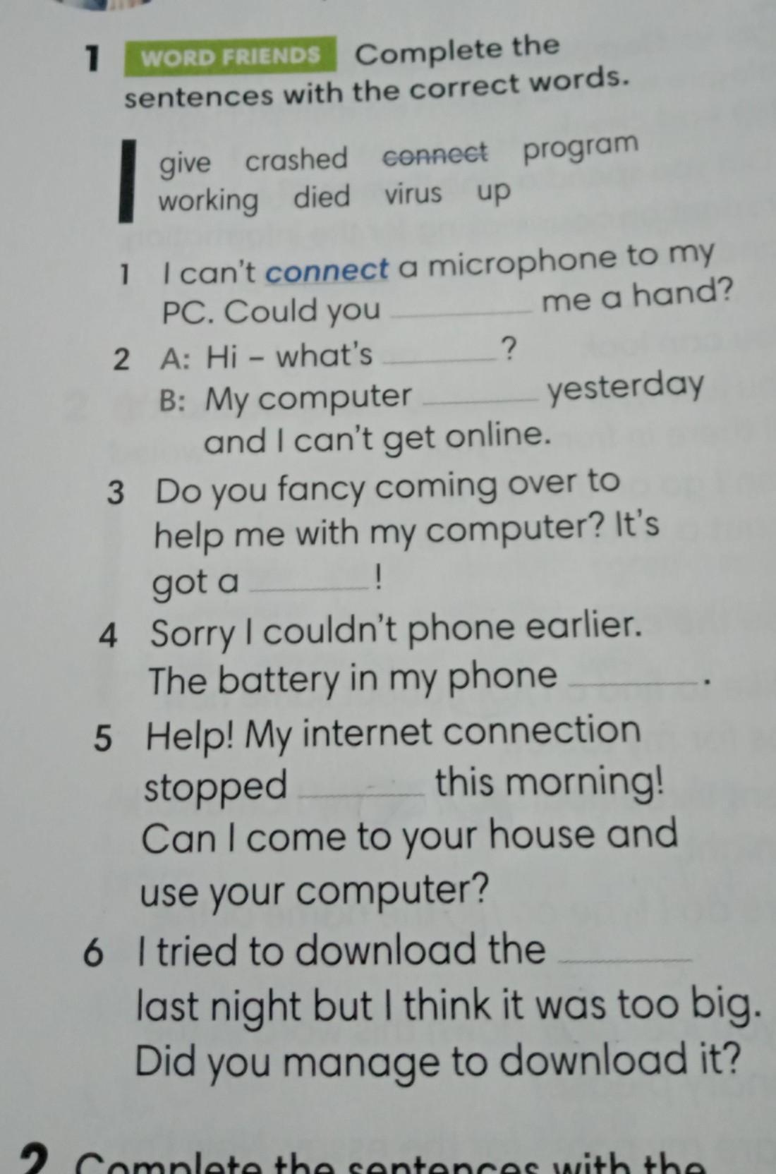 1 WORD FRIENDS Complete the sentences with the correct words. give crashed connect program working died virus up 1 I can't connect a microphone to my PC. Could you me a hand? 2 A: Hi - what's B: My computer ? yesterday and I can't get online. 3 Do you fancy coming over to help me with my computer? It's got a ! 4 Sorry I couldn't phone earlier. The battery in my phone 5 Help! My internet connection stopped this morning! Can I come to your house and use your computer? 6 I tried to download the last night but I think it was too big. Did you manage to download it?