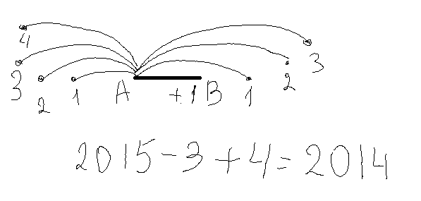 На координатной прямой отмечен отрезок АВ длиной 1 см, отмечены 3 точки с лева от АВ и 4 точки справа от АВ.Сумма расстояний от всех семи точек до А равна 2015 см.Чему равна сумма расстояний от всех точек до В?